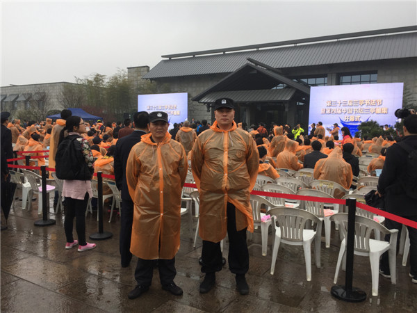 2017年3月30日上午,第三十三届兰亭书法节暨第四届中国书坛兰亭雅集在兰亭风景区开幕。早晨8时,绍兴市洪达保安服务有限公司驻兰亭风景区全体保安员及公司突击保安队到达开幕式现场,对兰亭风景区书法博物馆区域安保力量布置到位。9时许,省市级领导、各方代表及工作人员陆续到位。经绍兴市代市长马卫光致辞,中国书法家协会主席苏士澍讲话,浙江省文联书记处书记赵雁君讲话后,中共绍兴市委书记彭佳学宣布兰亭书法节开幕。开幕式结束,省市级领导及各方来宾参观了曲水流觞等名胜古迹。此次安保工作,保安队员冒雨工作,不负重托,不辱使命,使得兰亭书法节开幕式顺利进行,为绍兴市洪达保安服务有限公司受到各方来宾一致好评做出了贡献。